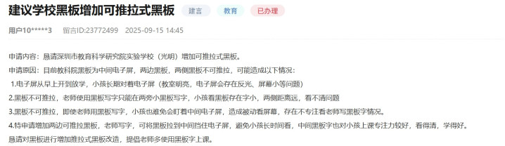 近日,有家长在深圳市建言板块留言称:恳请深圳市教育科学研究院实验学校(光明)增加可推拉式黑板,“目前教科院黑板为中间电子屏,两边黑板,但两侧黑板不可推拉。”